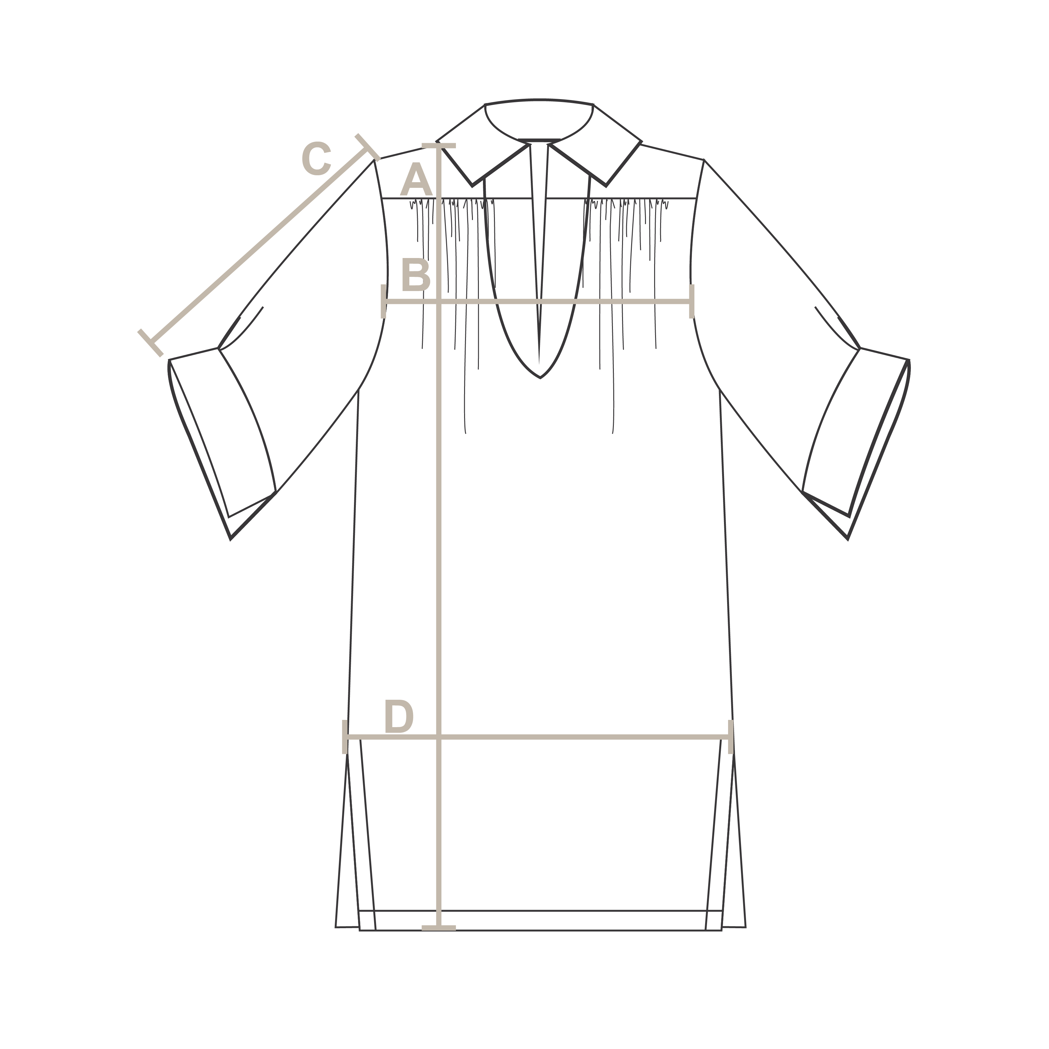 Túnica corta con cuello y escote en "V". Manga 3/4 y puños con tajo sin botones.